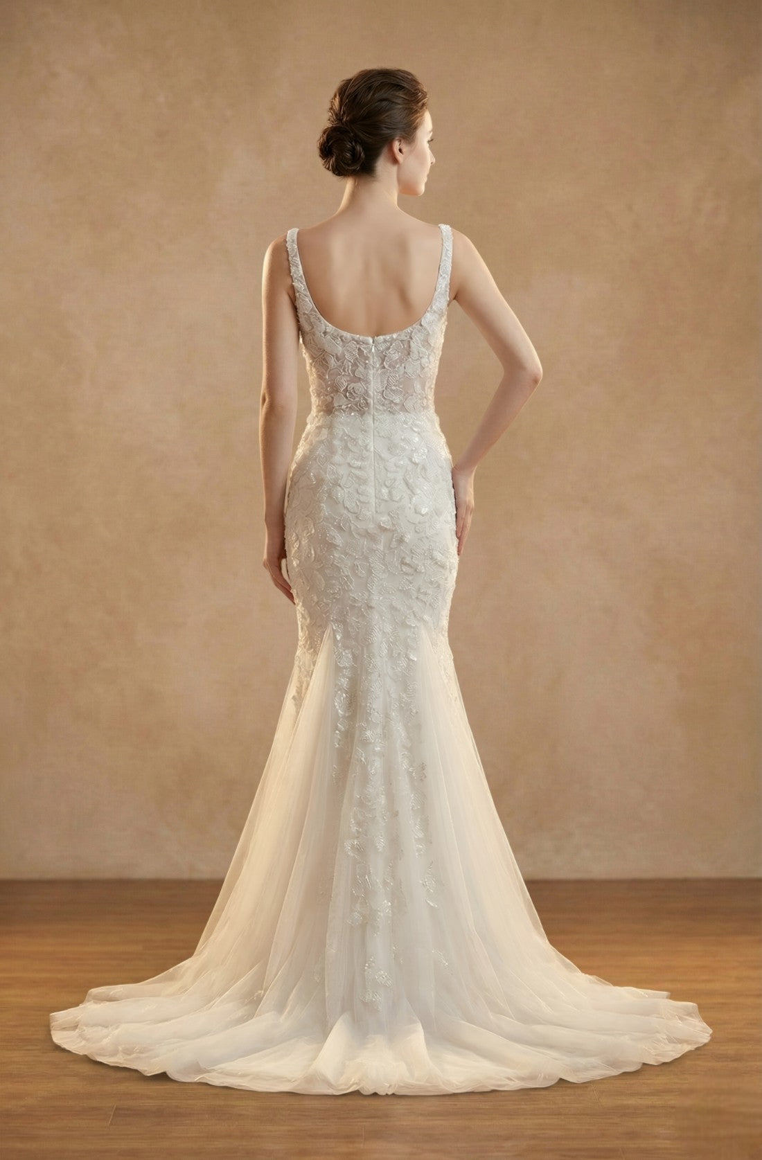 The Aurelia Cathedral Tulle Gown combines timeless charm with graceful movement. Featuring a flattering A-line silhouette and natural waist, this gown is designed with a classic sweetheart neckline and sleeveless bodice. Delicate lace appliqués and patterned embroidery enhance the airy tulle fabric, while illusion accents add a soft, modern touch. A dramatic cathedral-length train trails elegantly behind, and the back is finished with a clean zipper and decorative buttons. With a built-in bra and breathable structure, this gown ensures you feel confident and comfortable throughout your special day.