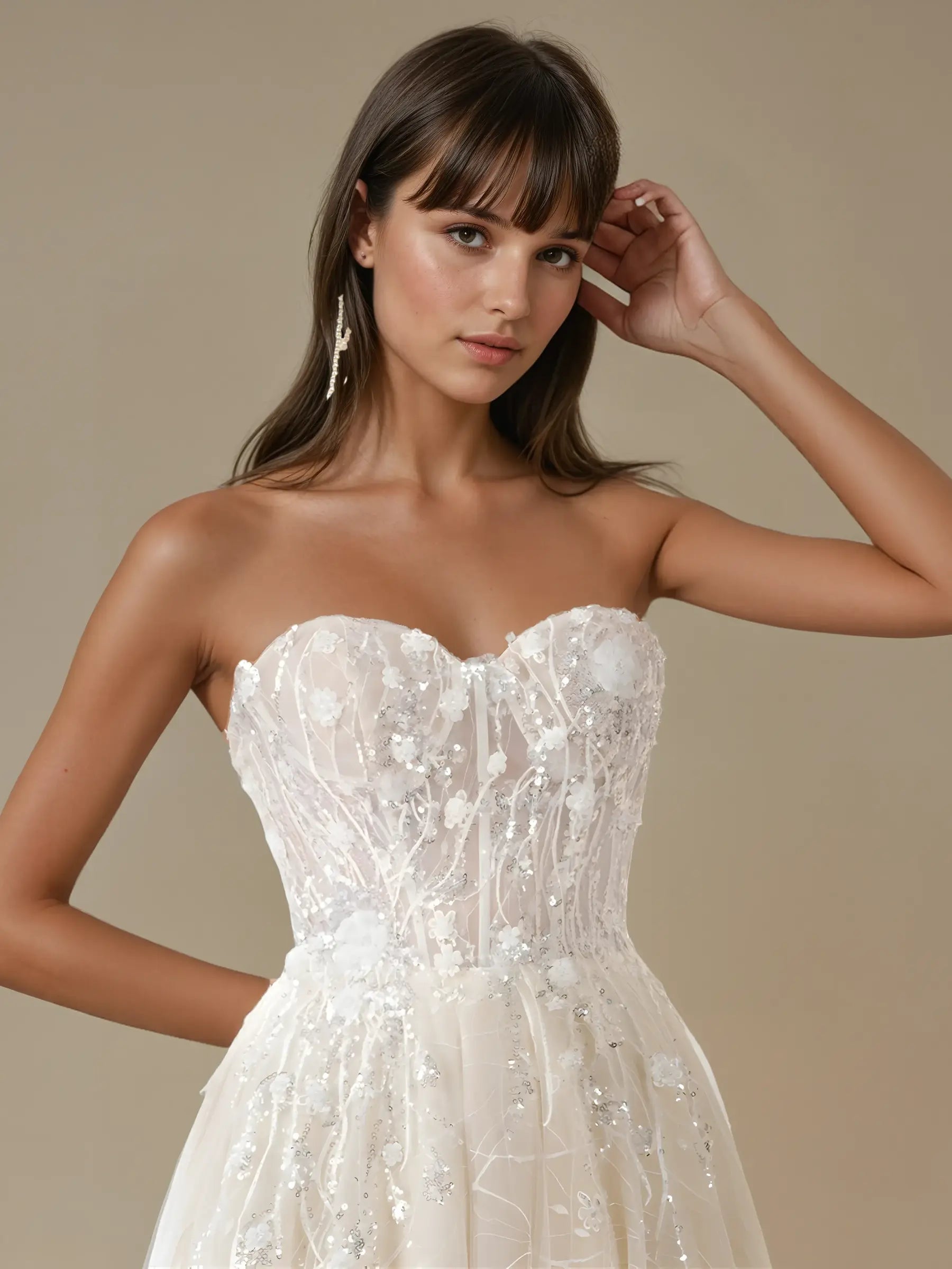 A strapless A-line gown with an empire waist and flowing Watteau train. Embroidered lace and a soft open back add timeless elegance.