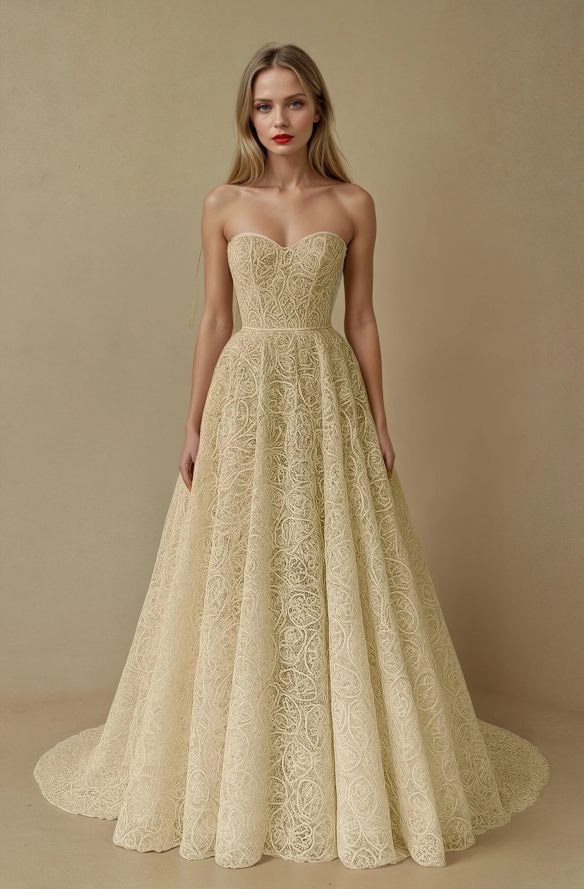 A strapless A-line gown adorned with intricate swirling lace, exuding timeless romance and modern sophistication.