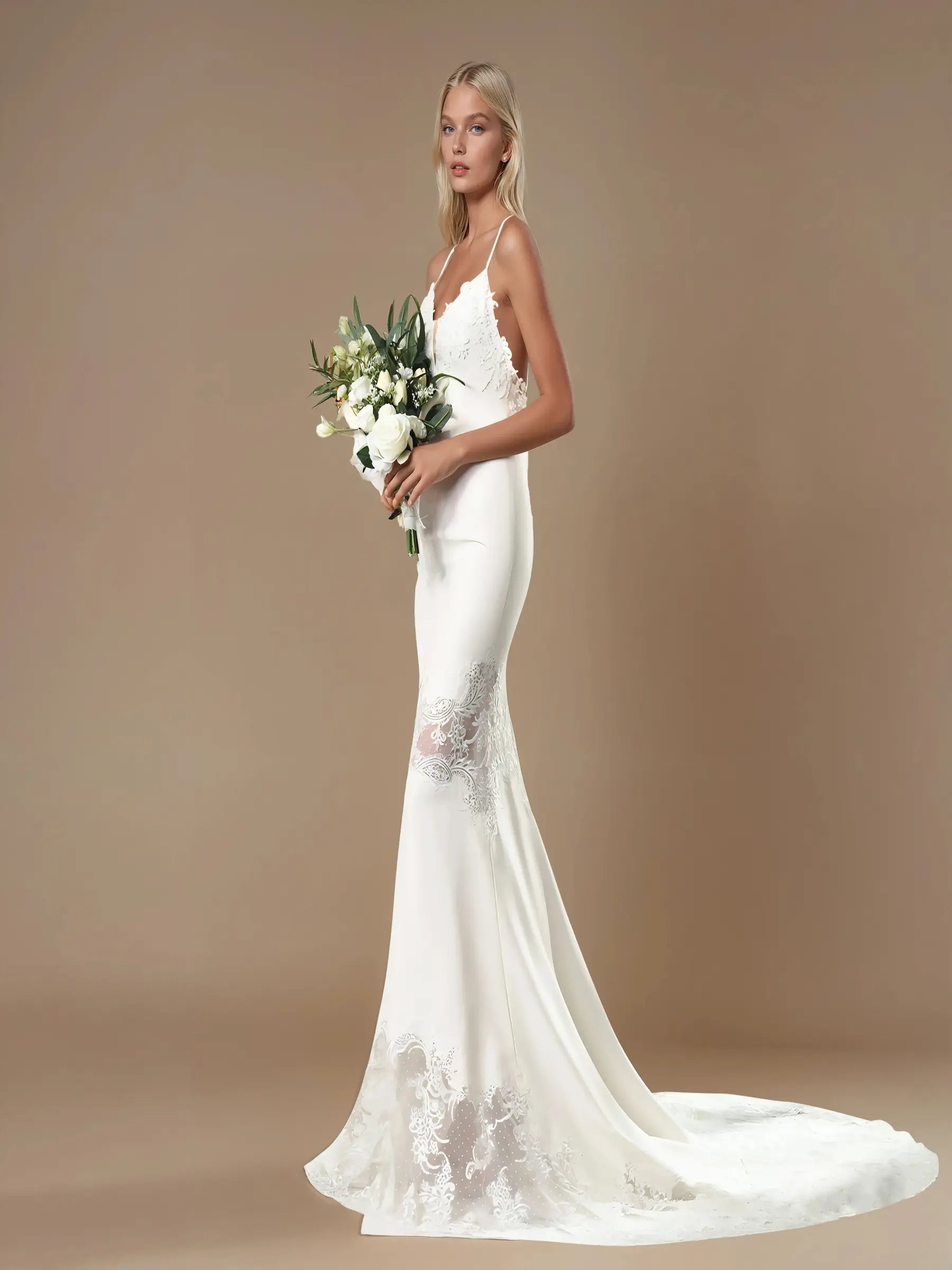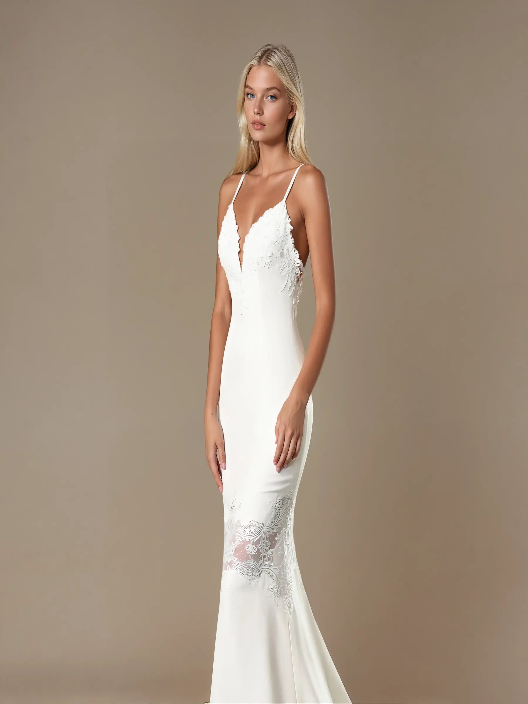 A soft A-line bridal gown with a plunging V-neckline, beaded lace appliqués, and a romantic backless finish. Designed for timeless elegance with a modern silhouette.