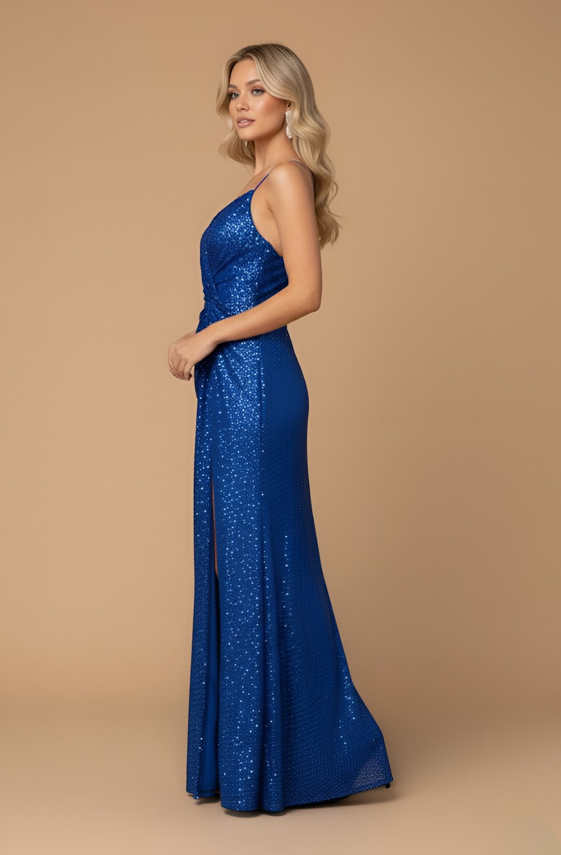 A sleek satin evening dress with sequin detailing and a unique criss-cross neckline. Designed to offer timeless elegance with a modest flair.