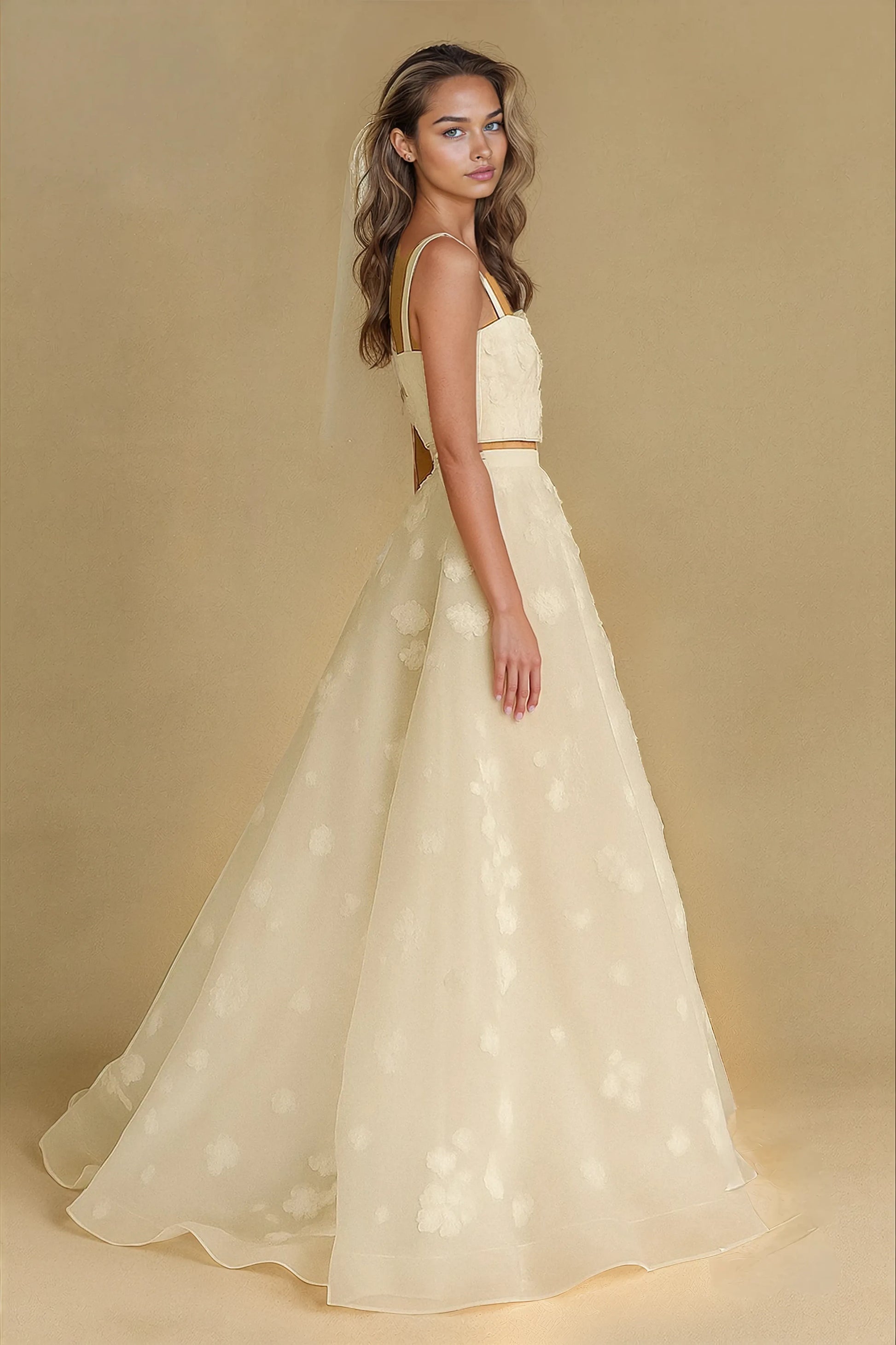 A romantic two-piece floral wedding gown with delicate appliqué detailing, featuring a cropped bodice and a flowing A-line skirt for a modern yet timeless bridal look.