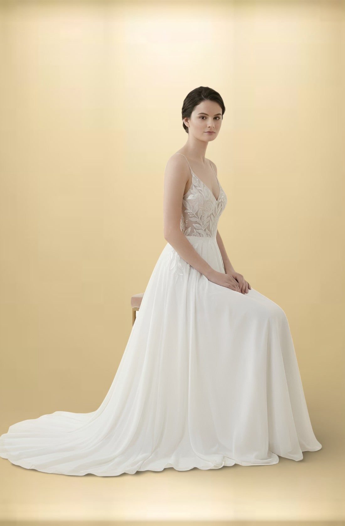 Designed for the modern bride, this floor-length crepe sheath gown features intricate applique, delicate beading, and subtle sequins for a refined sparkle. The natural waistline and sweep train create a graceful silhouette, while the illusion back and V-neck add a romantic touch. With breathable, eco-friendly fabric and built-in bra support, it's a perfect blend of comfort and elegance. The cap sleeves and backless design complete this look of effortless sophistication.