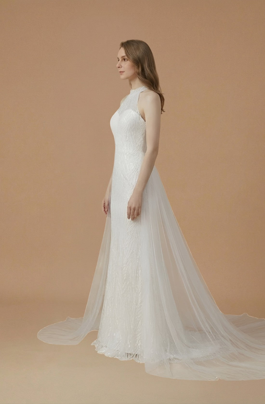 A chapel-train mermaid gown with halter neckline and vintage lace for a timeless silhouette.