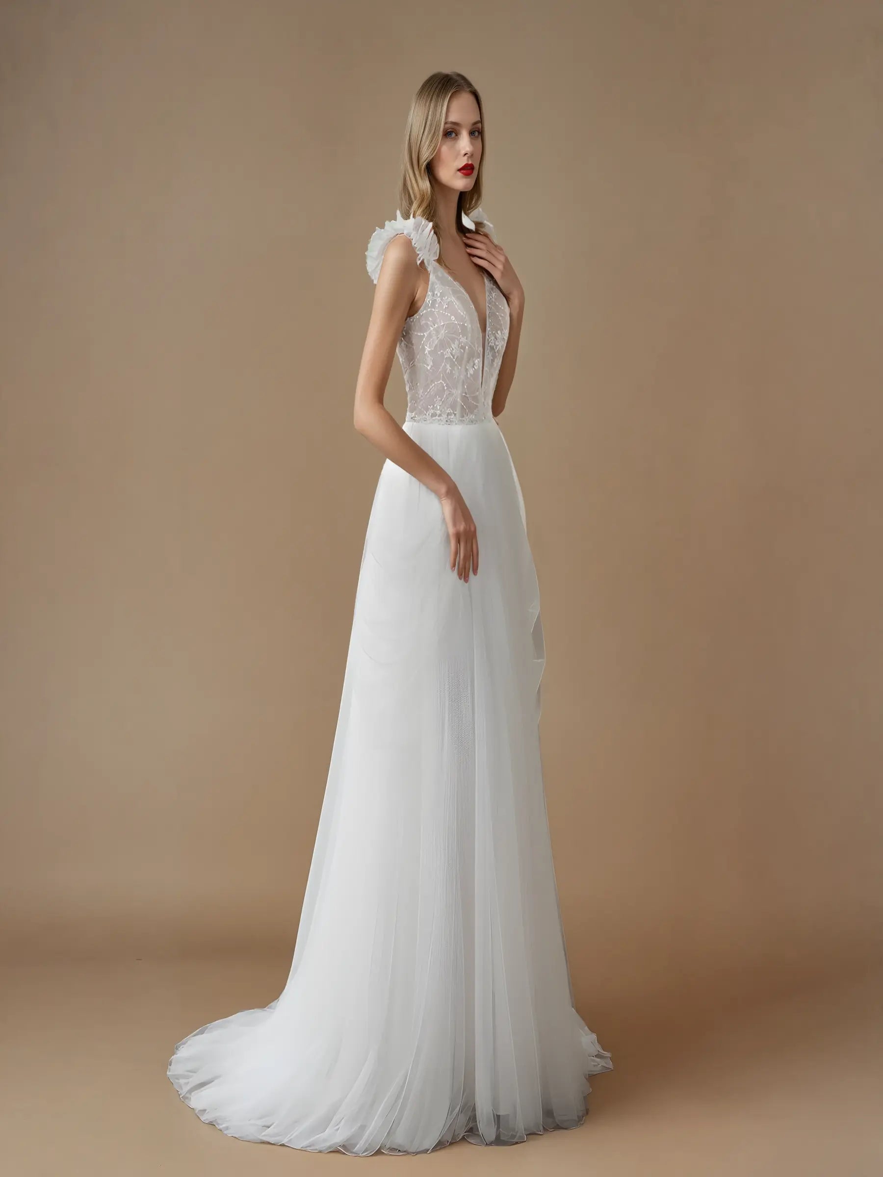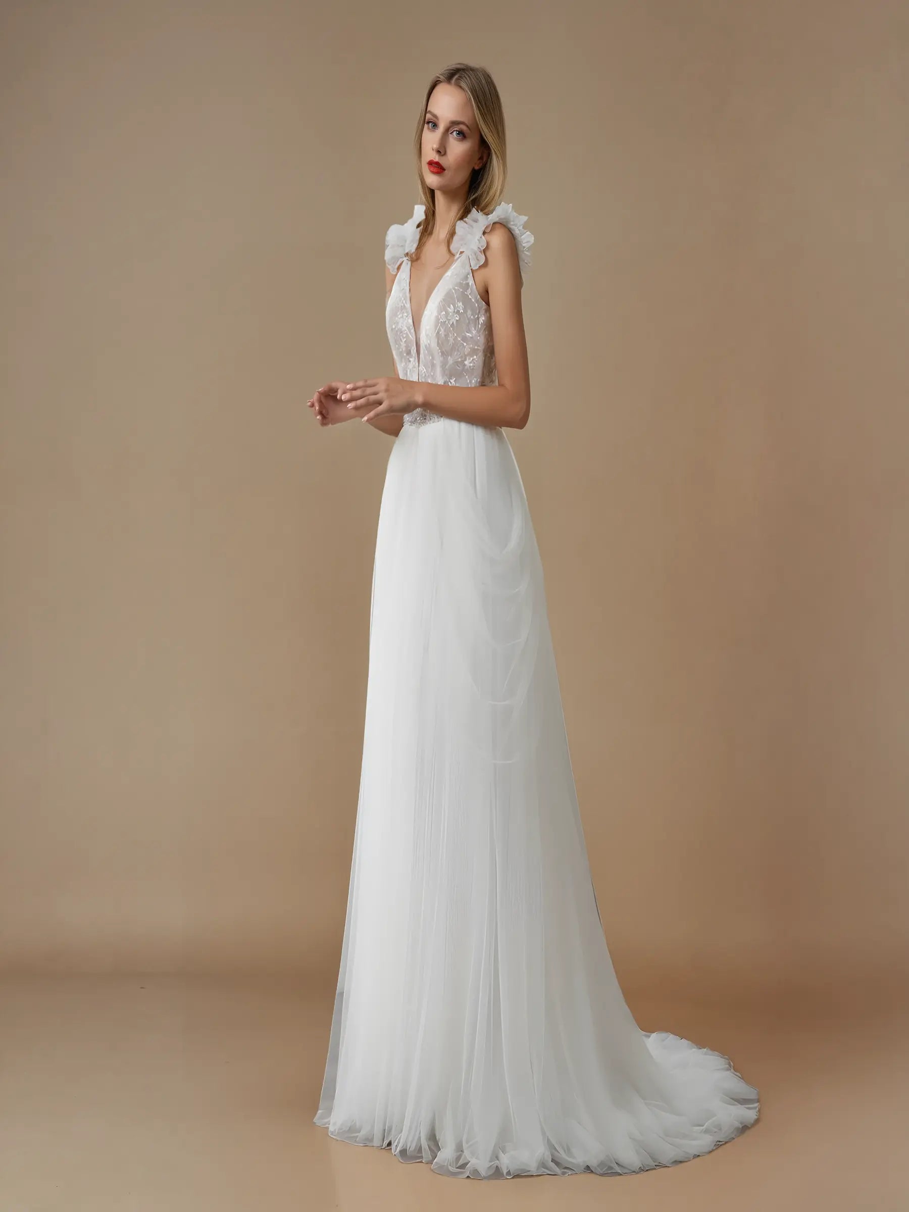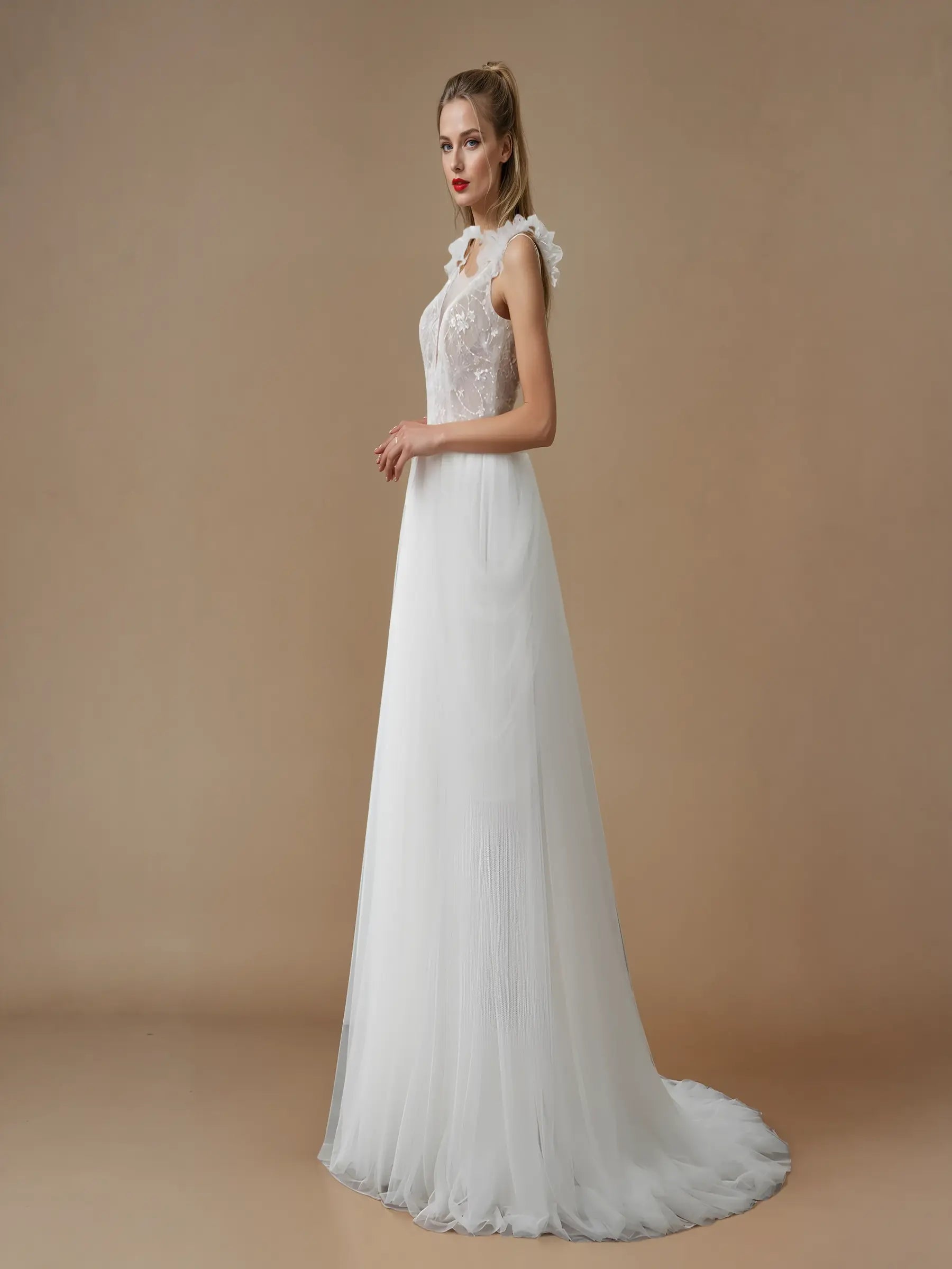 A charming A-line wedding dress with puff sleeves and an empire waist. Features delicate lacework, an O-neckline, and a flowing Watteau train.