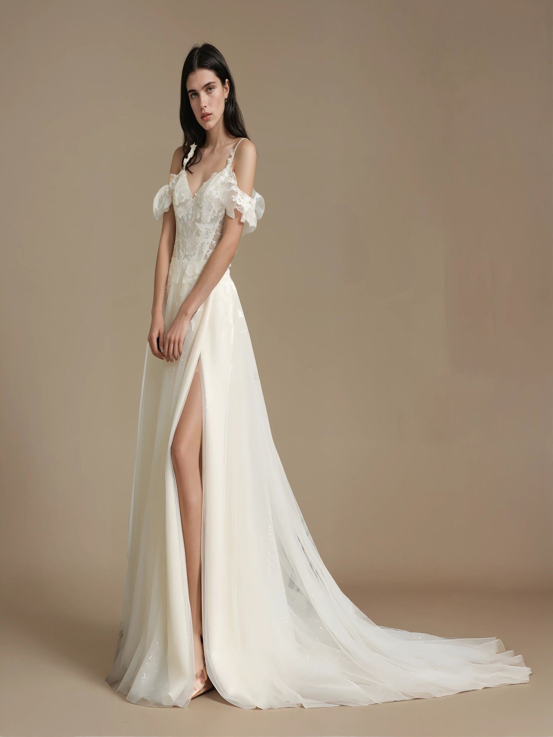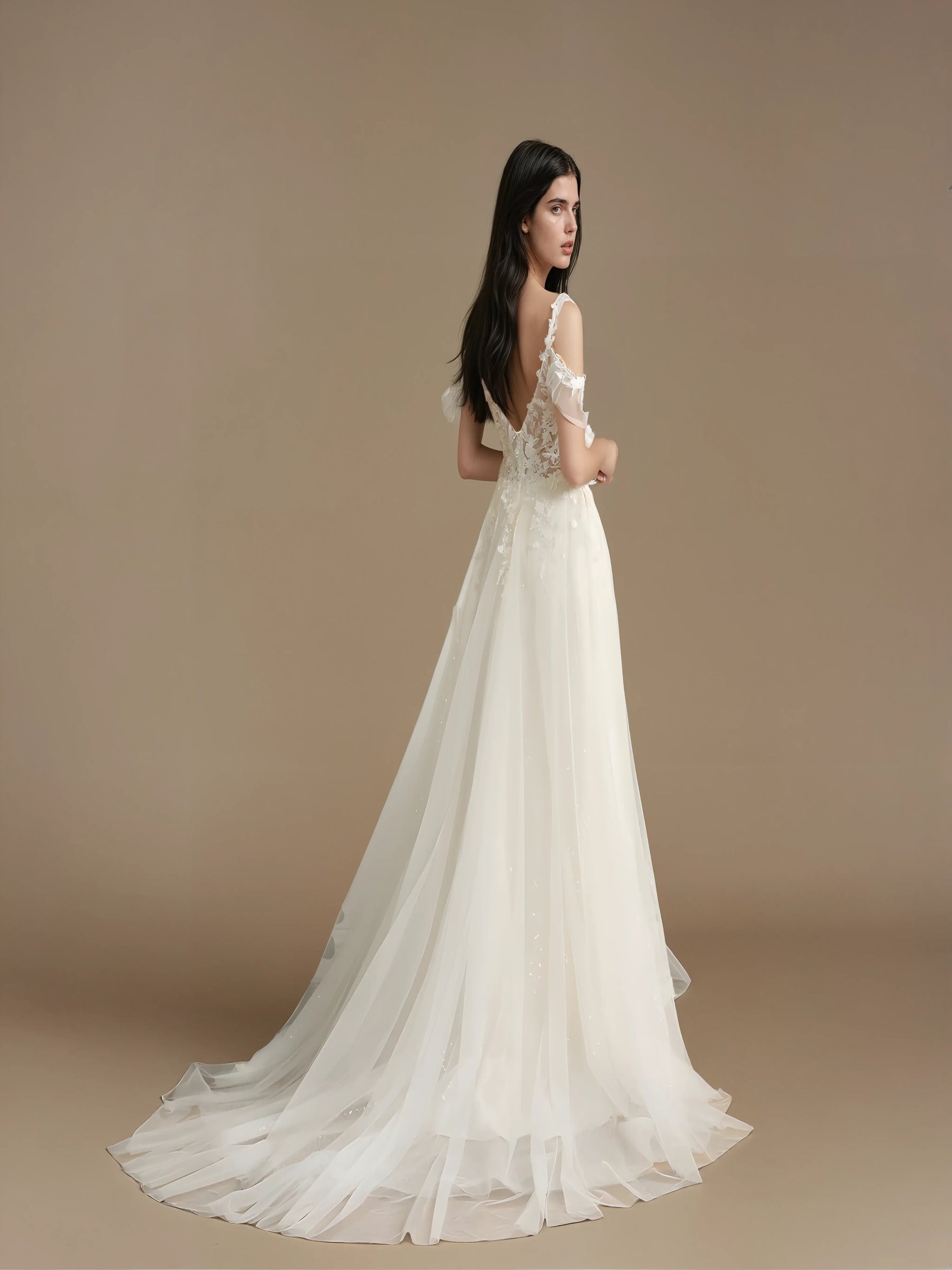 A graceful A-line gown with an empire waist and delicate lace detailing. Features a V-neckline, backless design, and a soft sweep train.