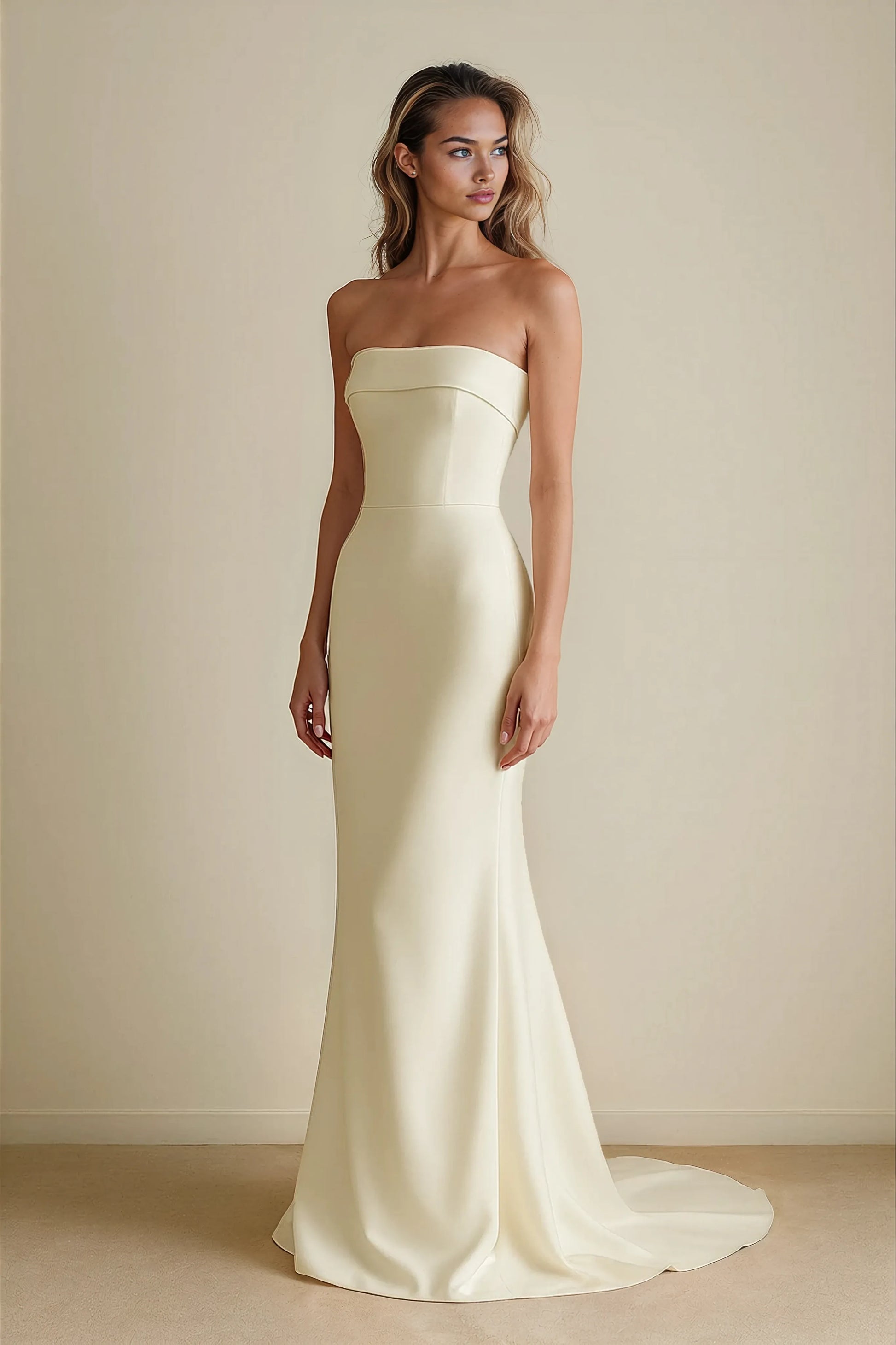 A strapless column bridal gown crafted in smooth satin, designed with clean lines and minimalist elegance for a timeless silhouette.