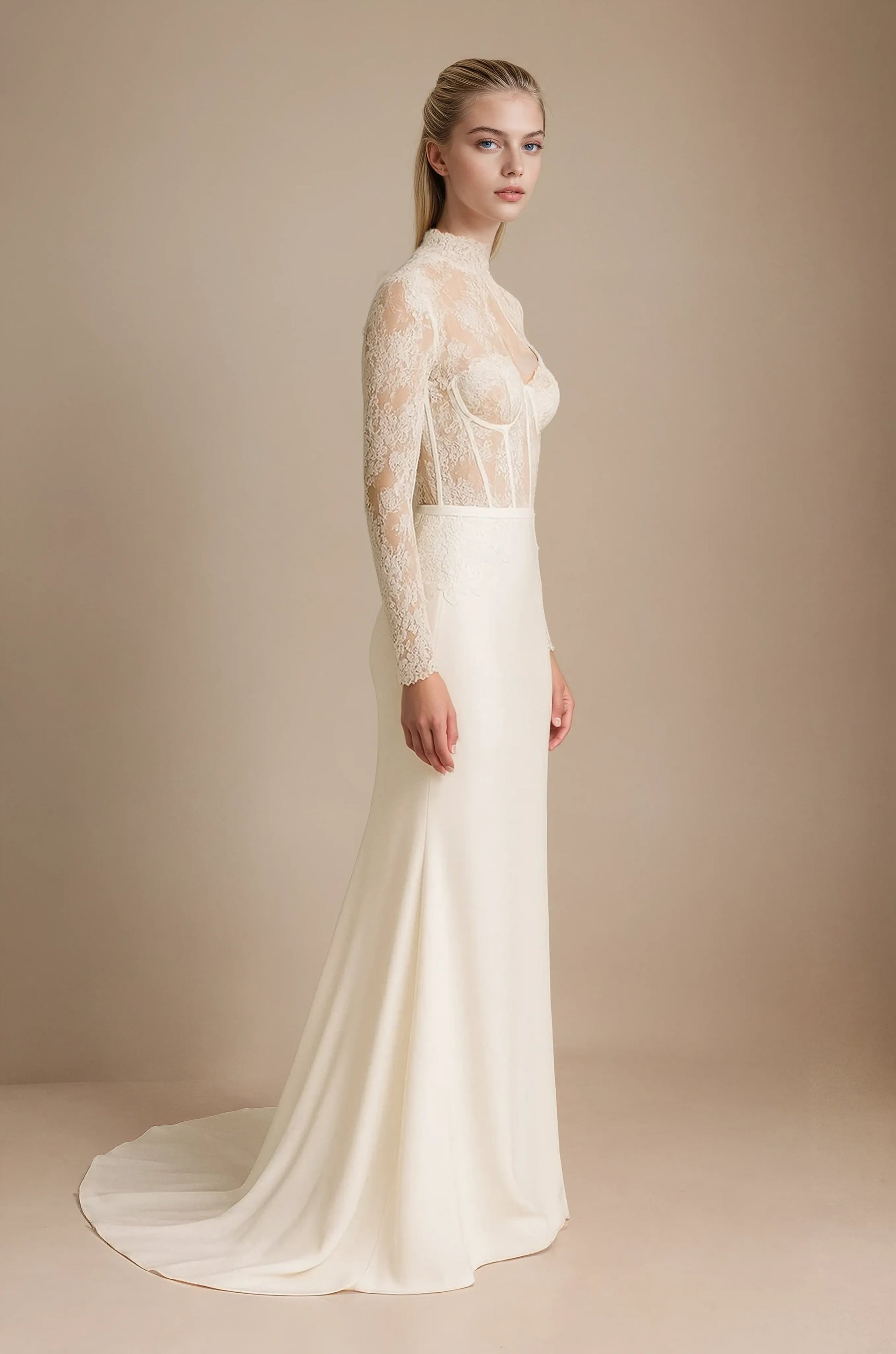 Modern high-neck wedding gown with a sheer lace corset and long sleeves. A smooth crepe-chiffon skirt skims the body and falls into a soft train. Complete the look with the lace-edged tulle veil.