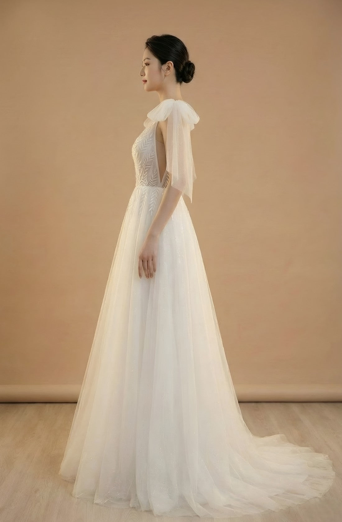 The Liora Lace A-Line Gown is a perfect blend of light elegance and modern charm. Crafted with a flattering empire waist and airy A-line silhouette, this gown features a deep V-neckline and sleeveless design that highlight the upper body. Floral lace appliqués and delicate embroidery flow gently throughout the dress, while the open back and hidden zipper add a refined finish. The soft sweep train adds just the right touch of drama as you walk. Complete with a built-in bra, this gown is breathable, comfortable, and timeless.