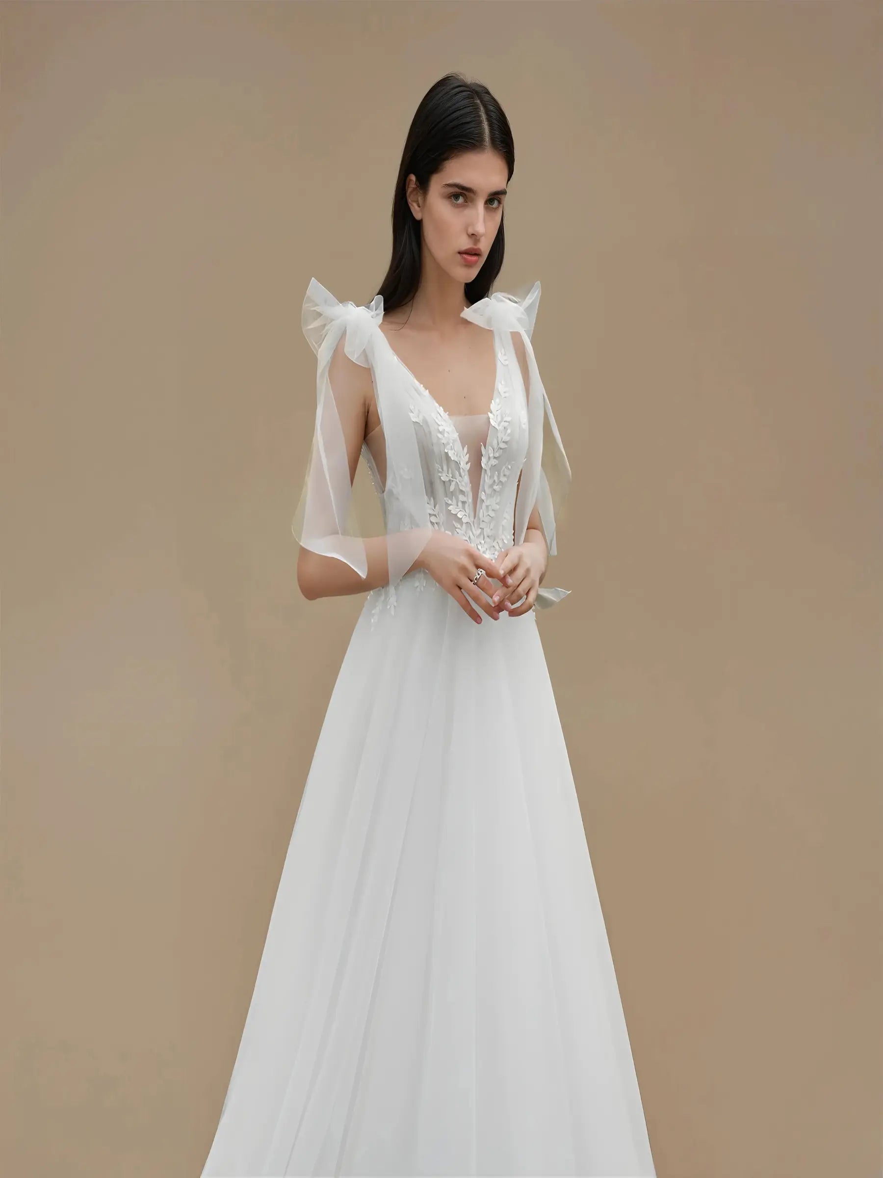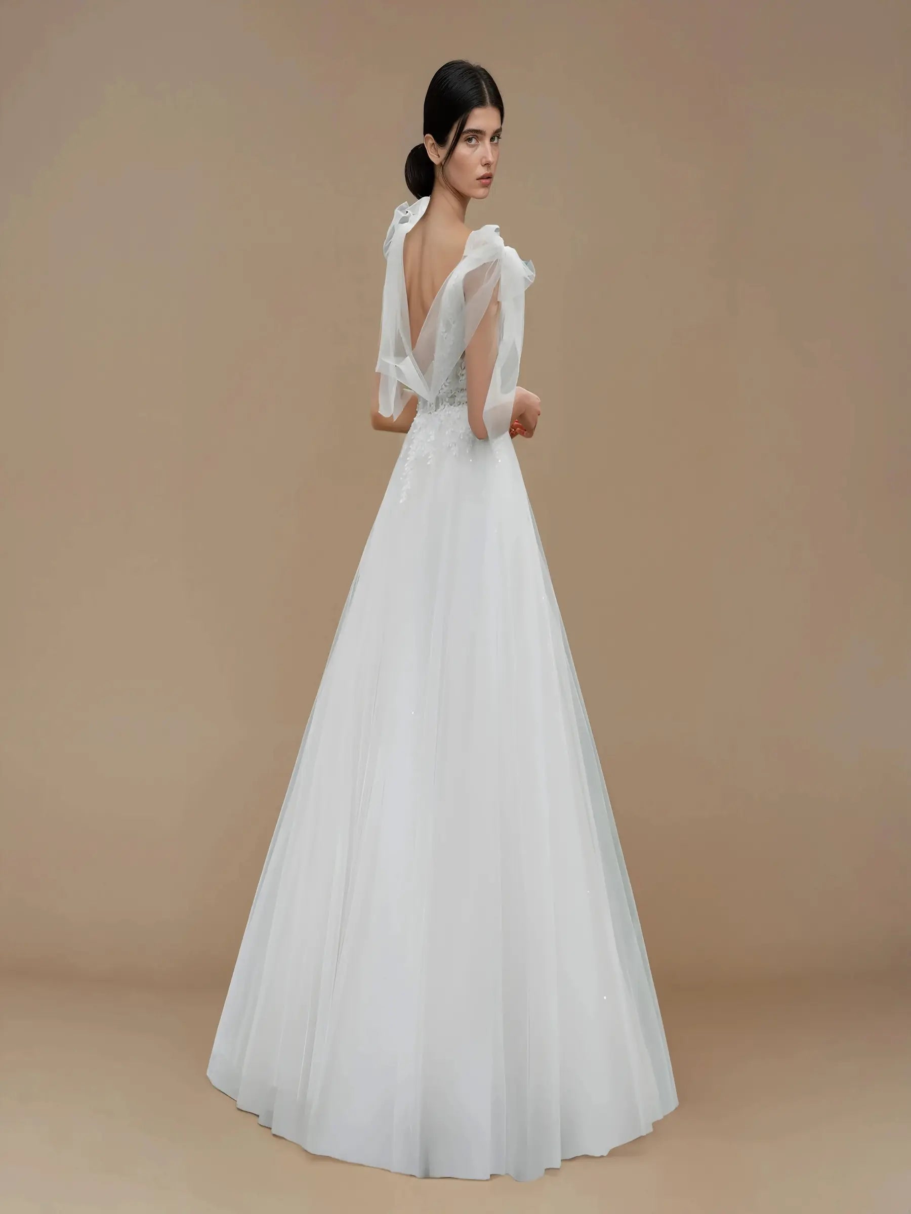 A romantic A-line gown with an empire waist and soft V-neckline. Features embroidered lace detailing, an open back, and a graceful sweep train.