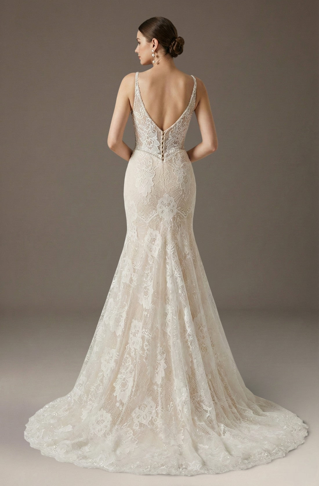 The Novara Beaded Lace Mermaid Gown blends modern simplicity with vintage charm.