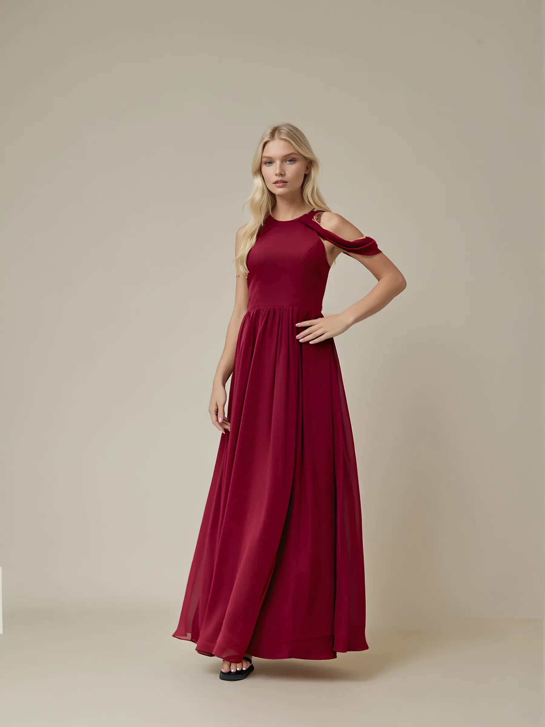 A floor-length chiffon gown with off-shoulder elegance, designed for timeless sophistication.