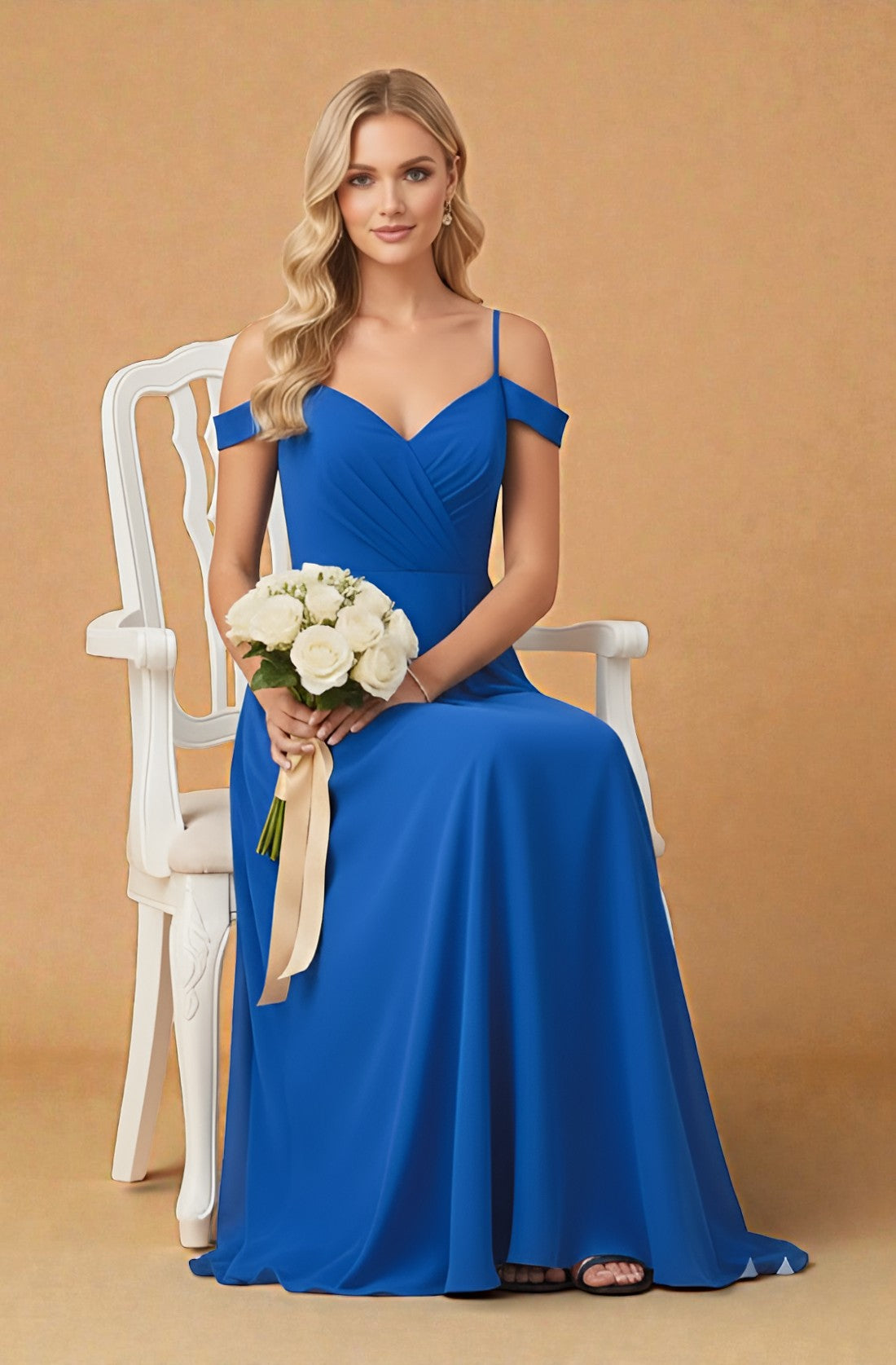 Graceful and modest, this floor-length chiffon gown features a flattering V-neck and off-shoulder design.