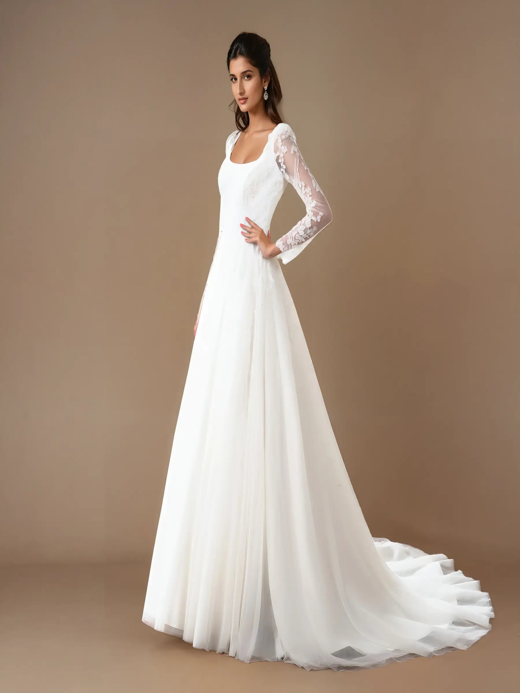 An elegant A-line gown with a square neckline and full lace sleeves. Features floral appliqués, a backless design, and a soft sweep train