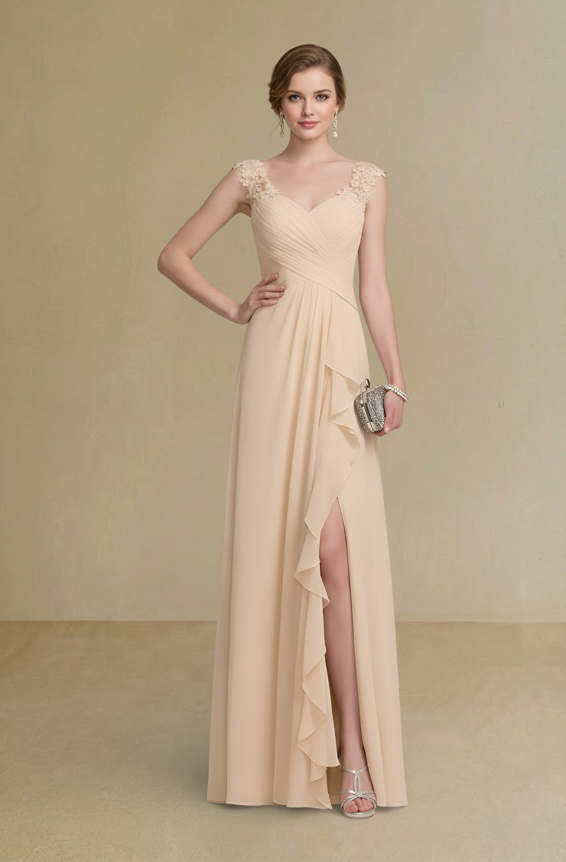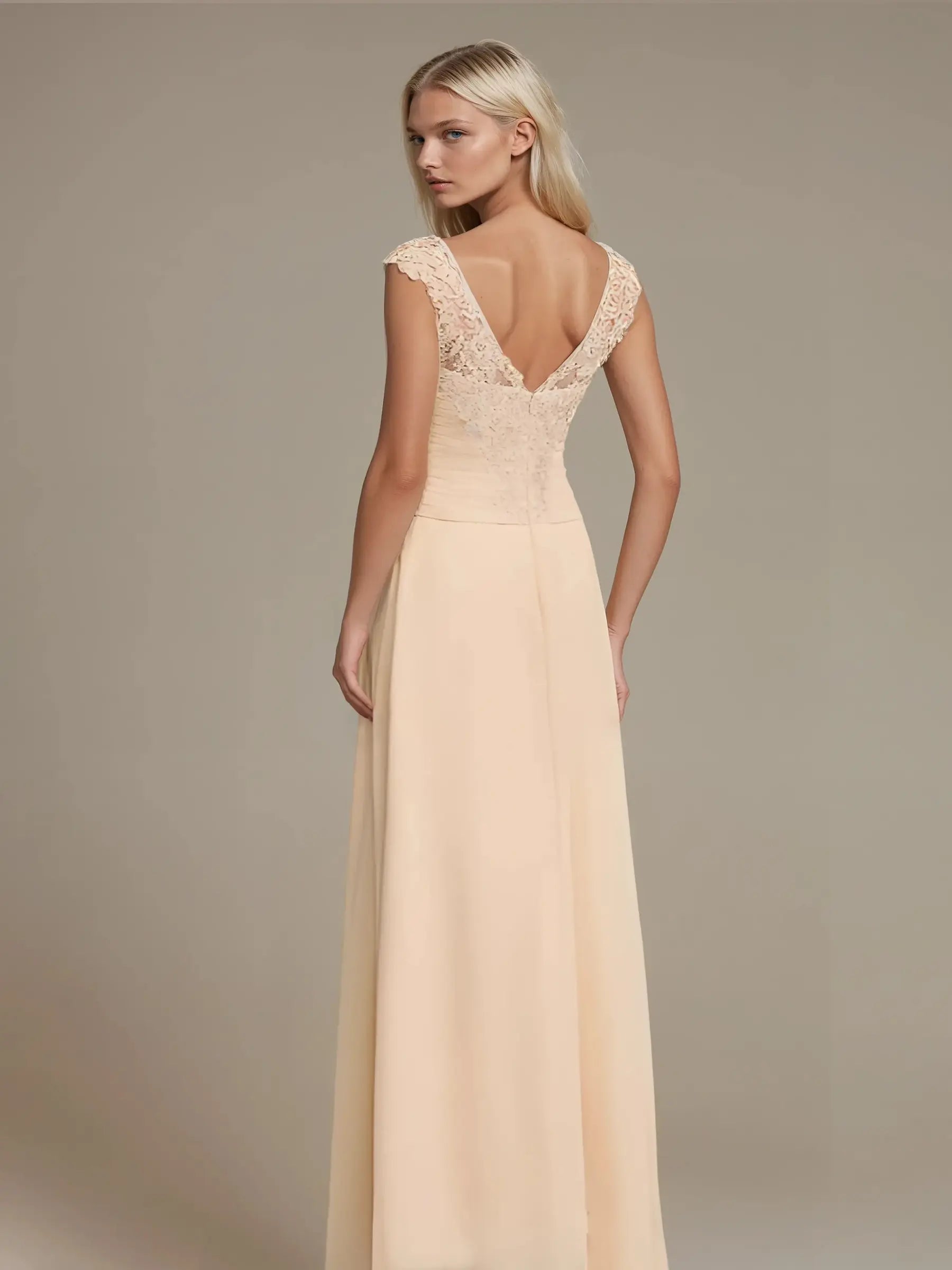A floor-length chiffon evening gown with a modest V-neck and empire waist. Flows gracefully with a soft sheer layer and elegant straight silhouette.