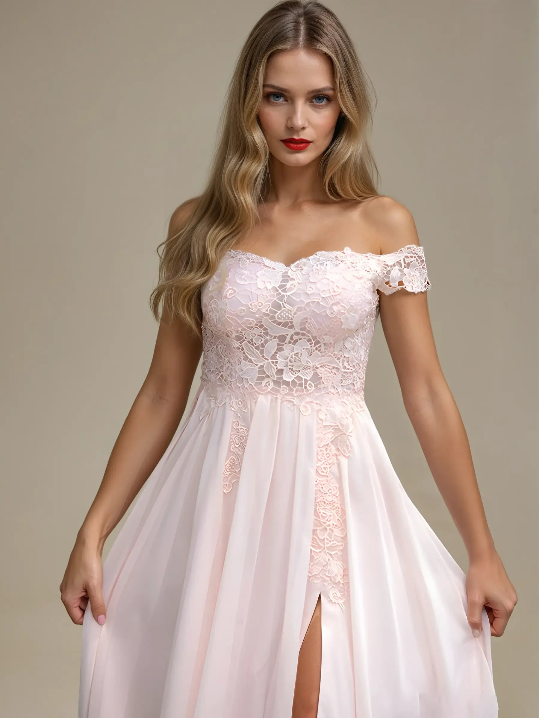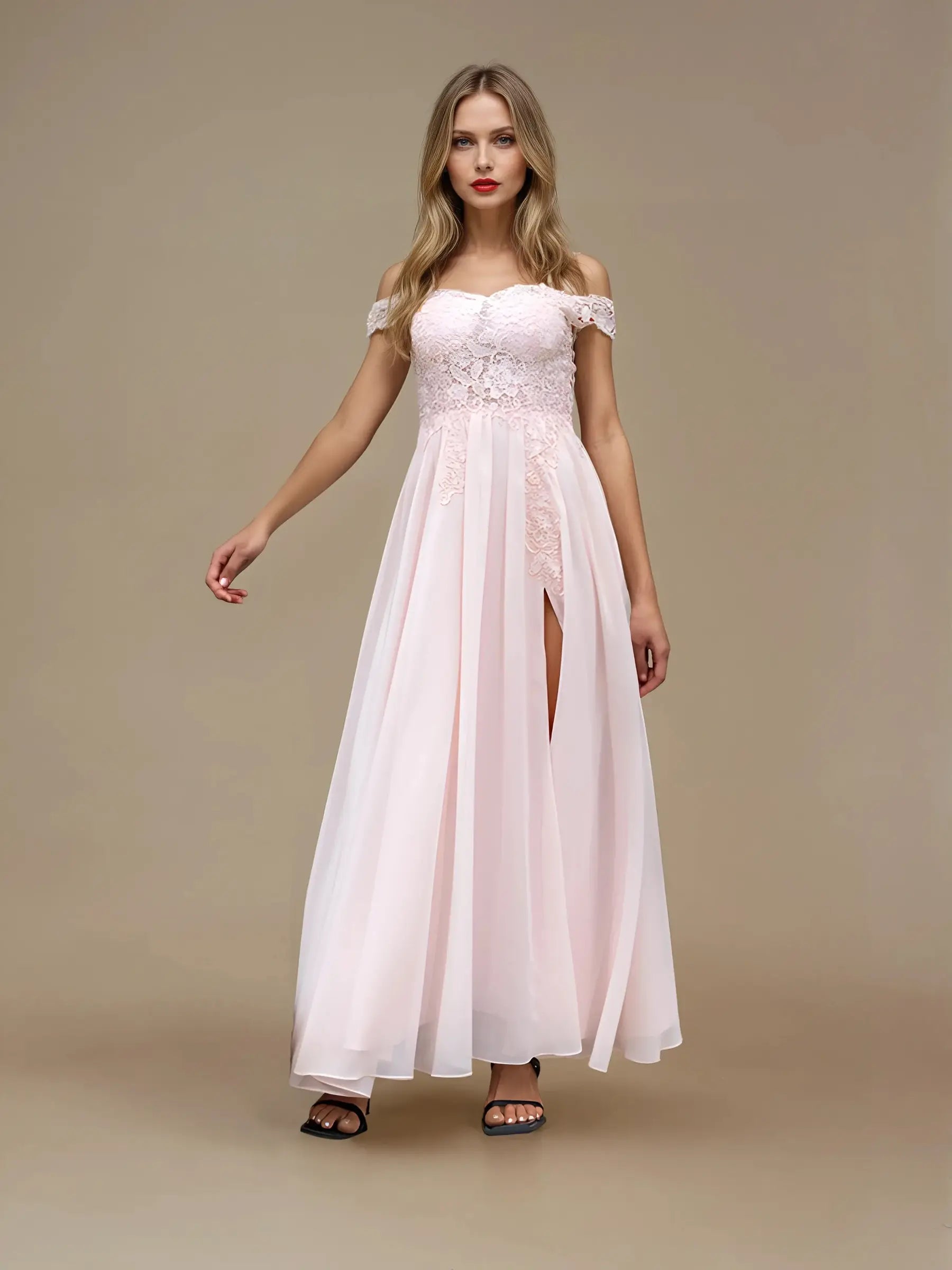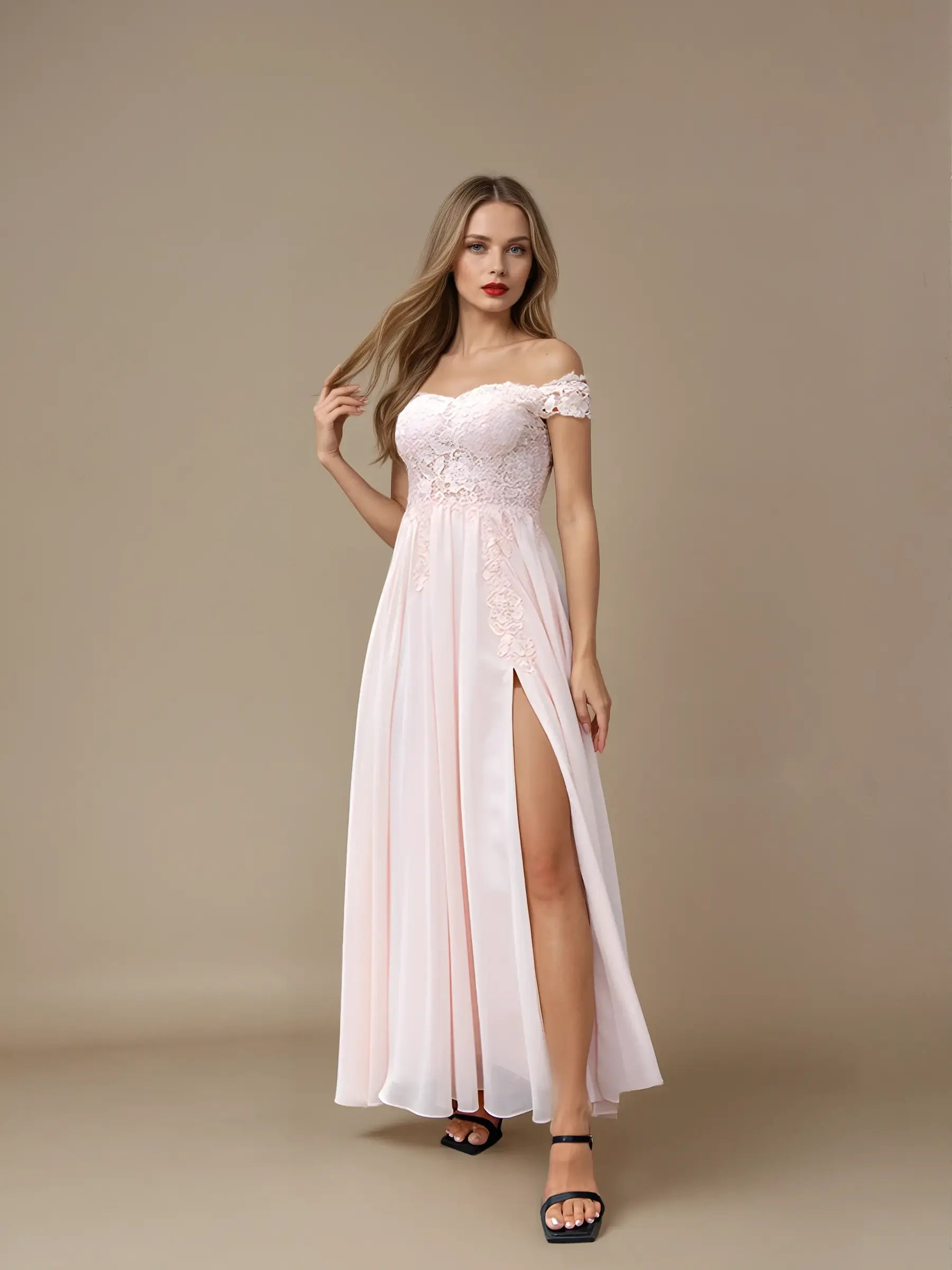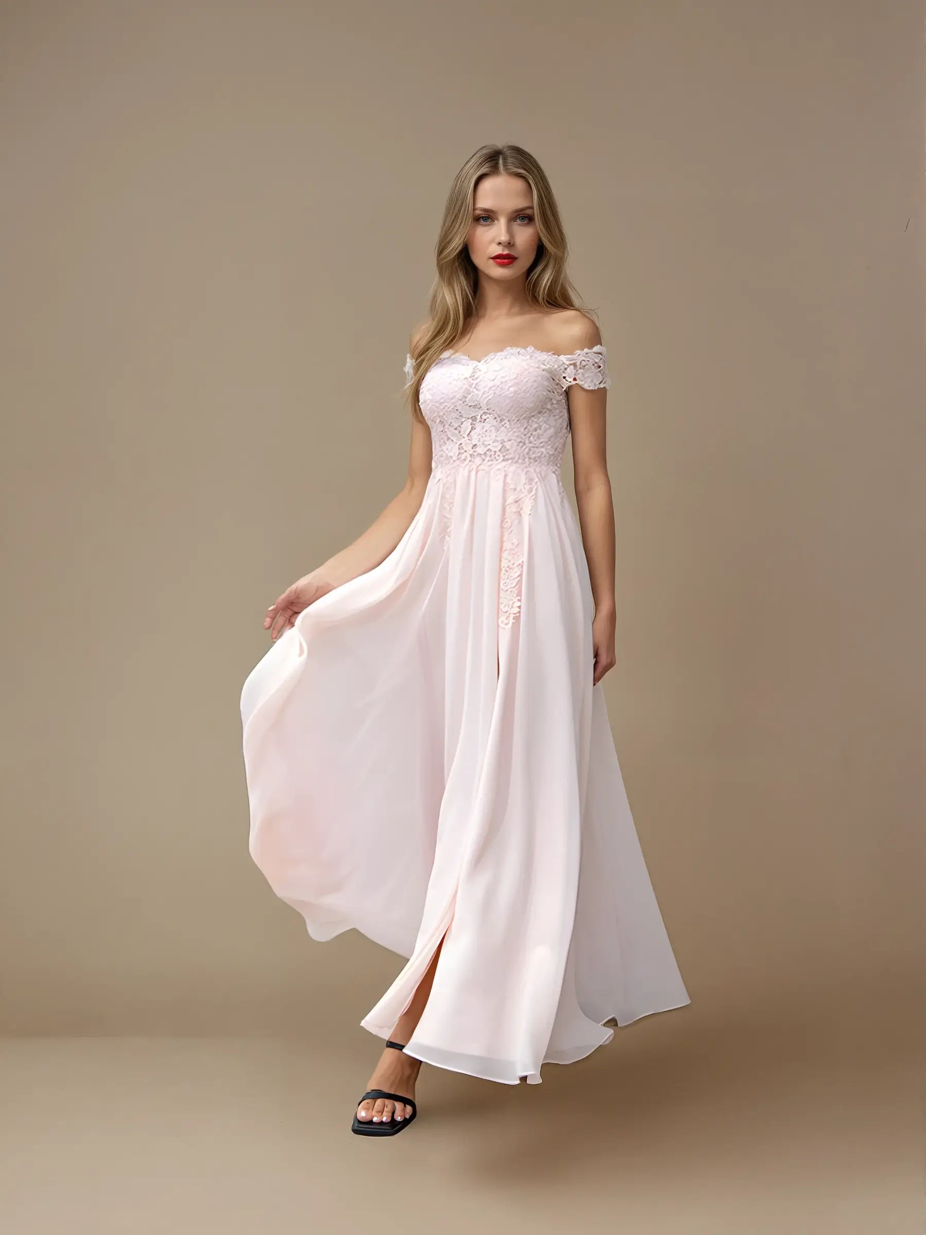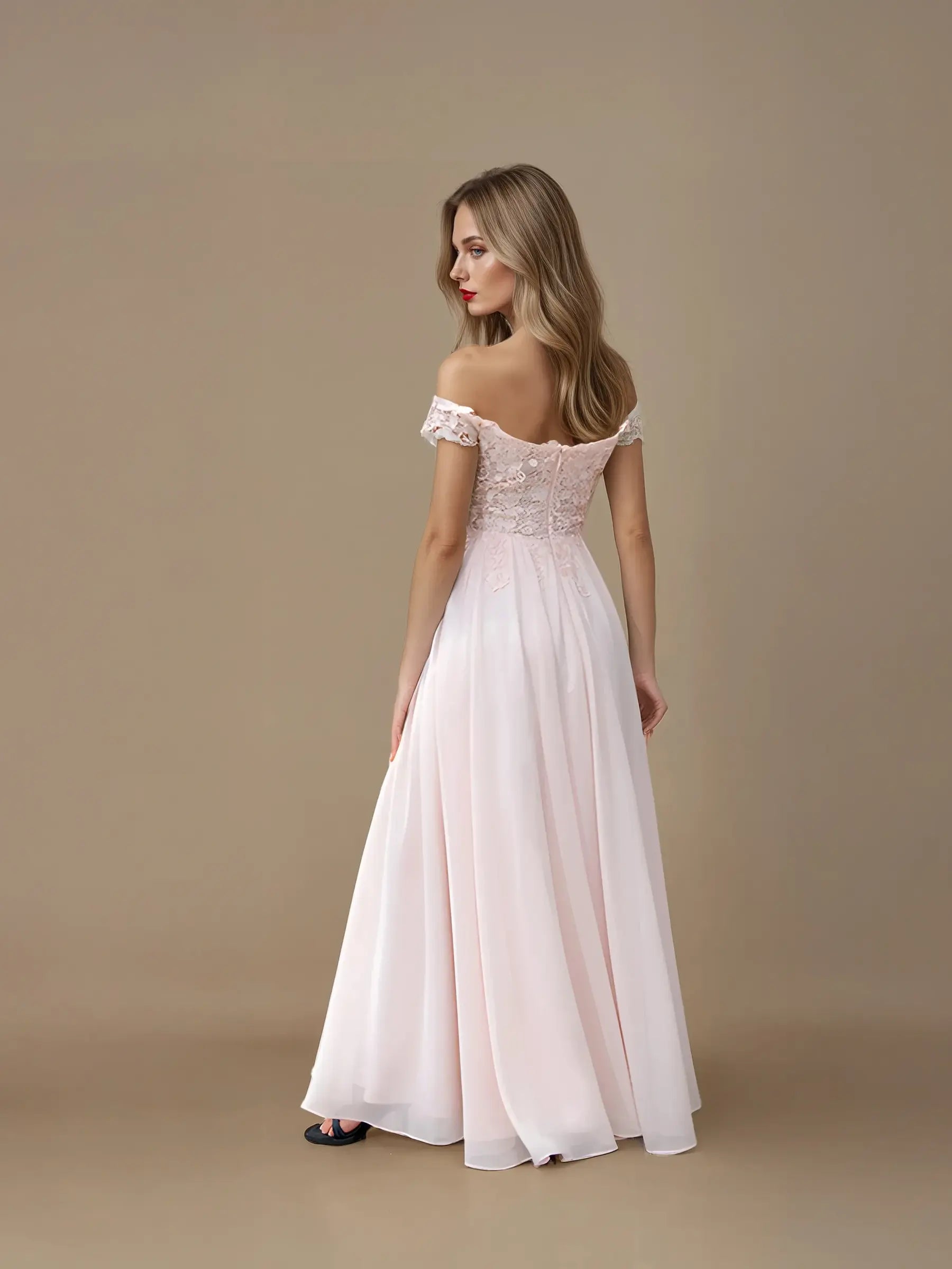 An elegant off-shoulder evening dress with soft floral embroidery and a flowing chiffon finish. Designed for grace, comfort, and style.