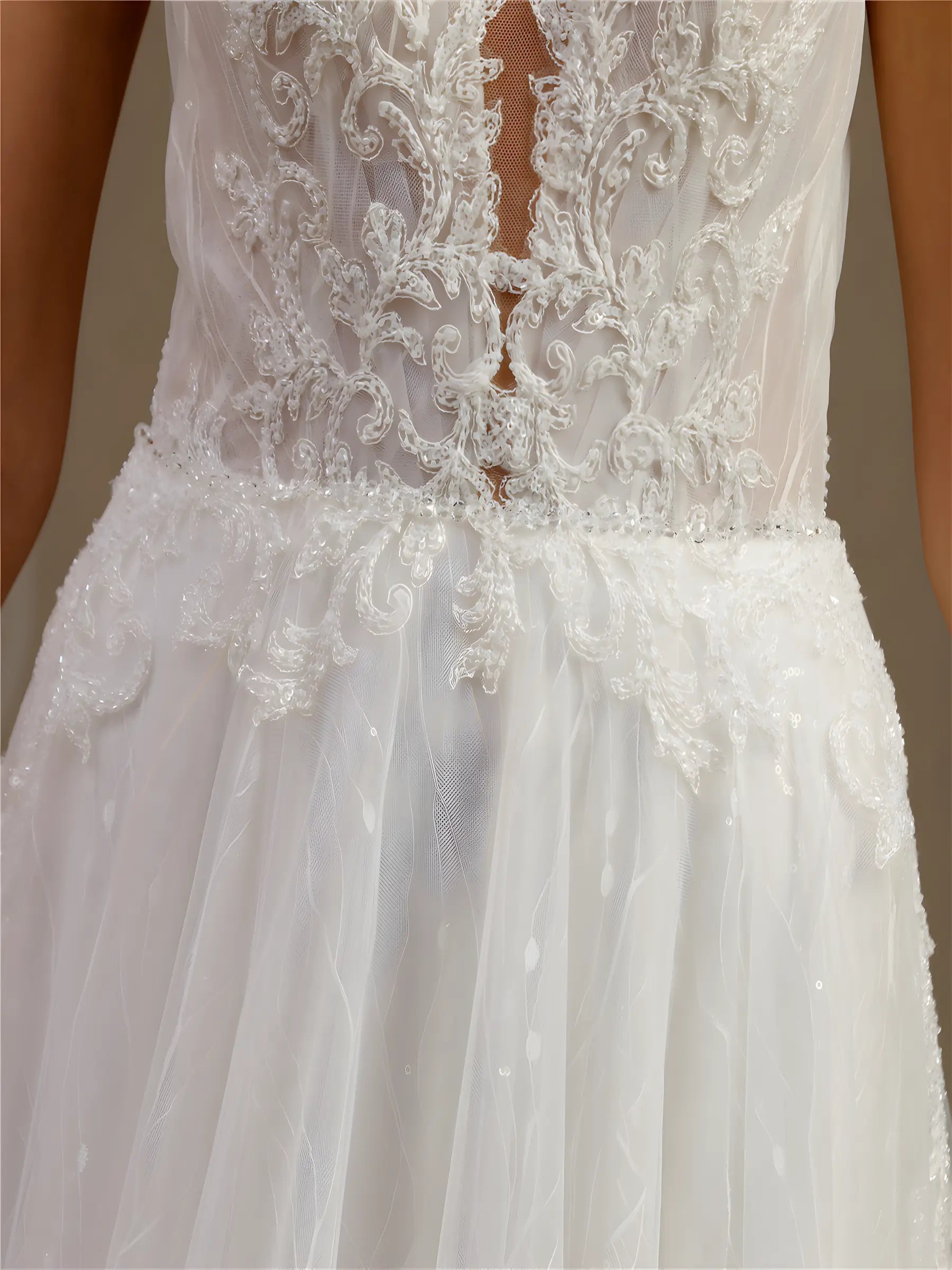 A romantic A-line gown with a plunging V-neckline and soft lace details. Features a flowing Watteau train and an open lace-up back.