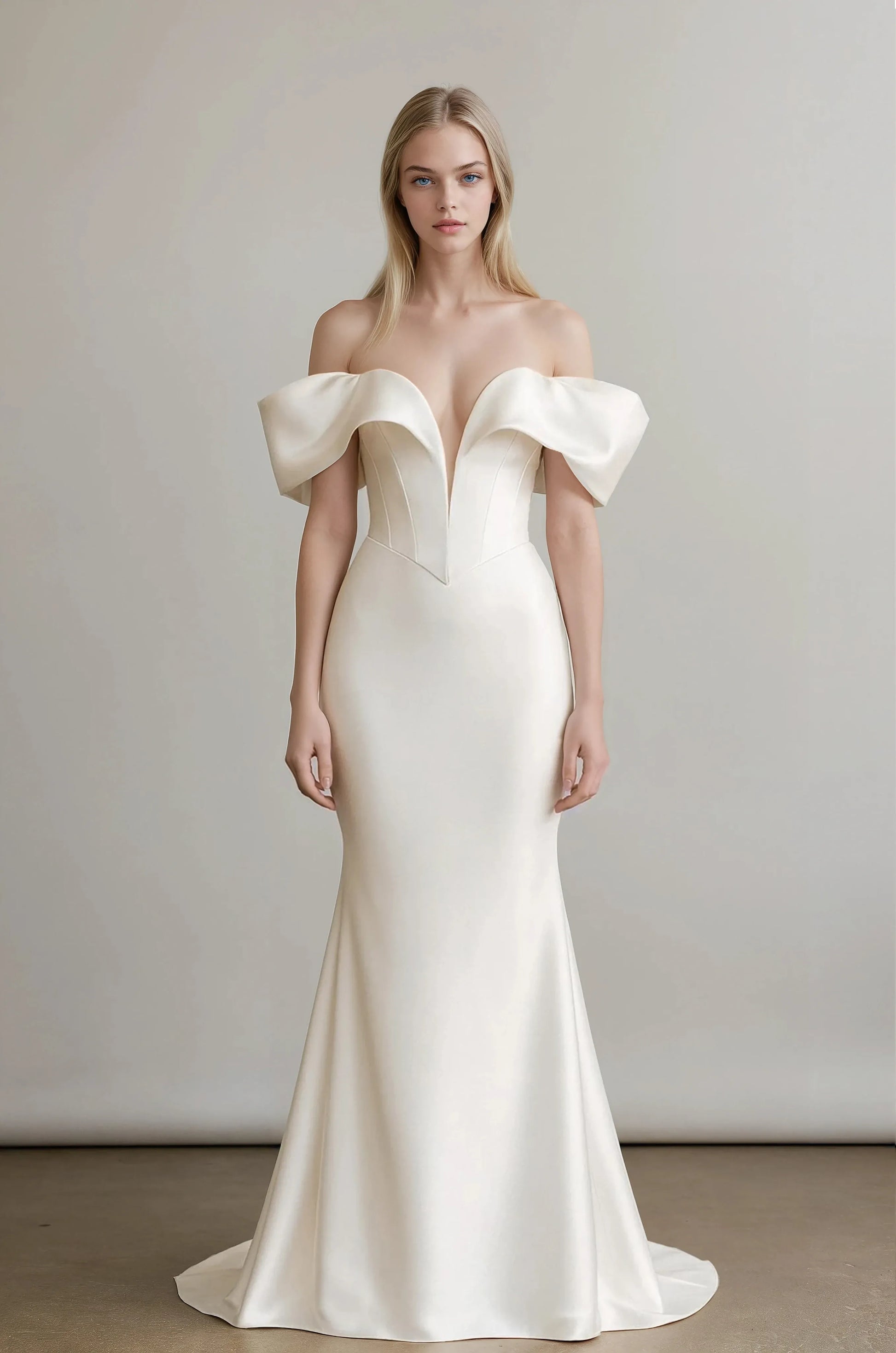 A couture mermaid gown with a sculptural off-the-shoulder, plunging neckline and a corseted waist, cut in luminous mikado/crepe that skims into a fluid fit-and-flare skirt.